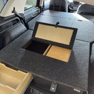Two integrated drawers span the length of your trunk to provide seamless storage and organization. These drawers include 3 removable dividers, slides rated to 250 lbs, and anti-rattle and key locking metal latches. Option to add bamboo work surfaces/false tops to each drawer for an easily accessible, rigid workspace whenever you need it.