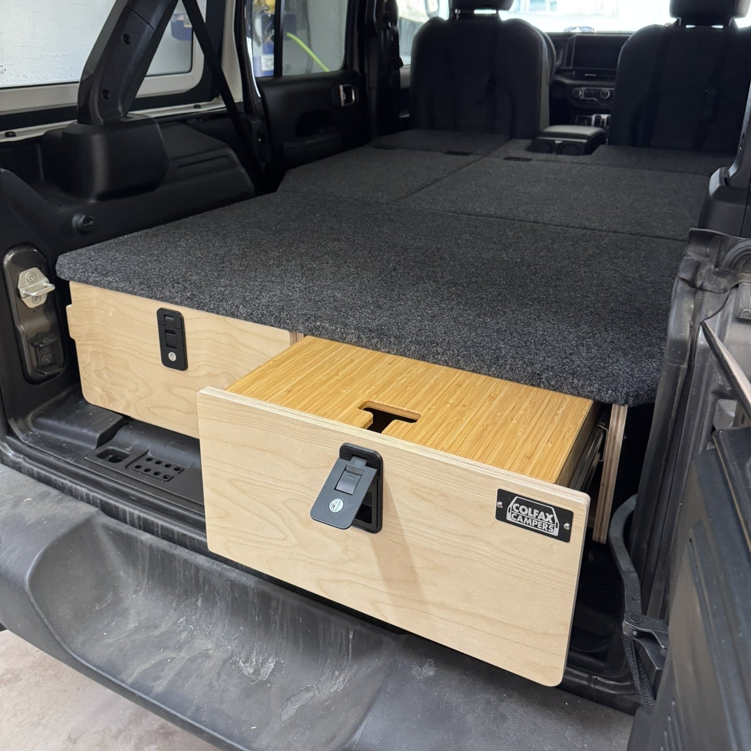 Our innovative 3-piece platform design requires zero modifications to your vehicle, using factory tie down rings and/or threaded holes to secure the drawer system. Set up the sleeper section in seconds and fully remove it when you need your 2nd row back.